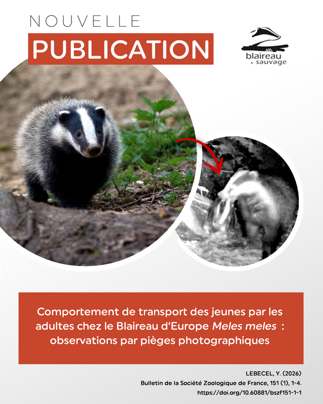 LEBECEL, Y. (2026).- Comportement de transport des jeunes par les adultes chez le Blaireau d’Europe Meles meles (Linnaeus, 1758) : observations par pièges photographiques. Bulletin de la Société Zoologique de France, 151 (1), 1-4.